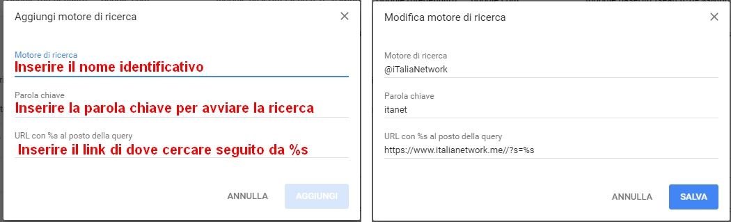 Nell’esempio sopra abbiamo inserito la scorciatoia per cercare velocemente nel nostro sito web. In questo modo, scrivendo nella barra di ricerca di Chrome, itanet e subito dopo la parola che vogliamo cercare, partirà la ricerca di quella parola direttamente sul sito web di iTaliaNetwork.