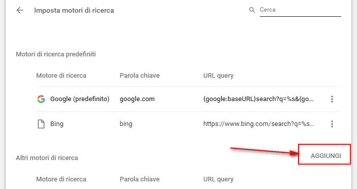 Nella pagina che si aprirà potreste avere già dei motori di ricerca inseriti. Per aggiungere il vostro personalizzato dovete cliccare su AGGIUNGI.
