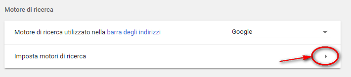 Scorrere fino a quando non si incontra la sezione Motore di ricerca e cliccare sulla freccia nella riga Imposta motori di ricerca.