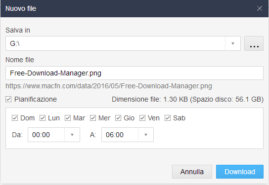 Spuntando sul quadratino di fianco a Pianificazione sarà possibile pianificare il download in un giorno ed orario specifico (utile magari nel caso abbiate moltissimi download e vogliate dare priorità ad alcuni piuttosto che ad altri).